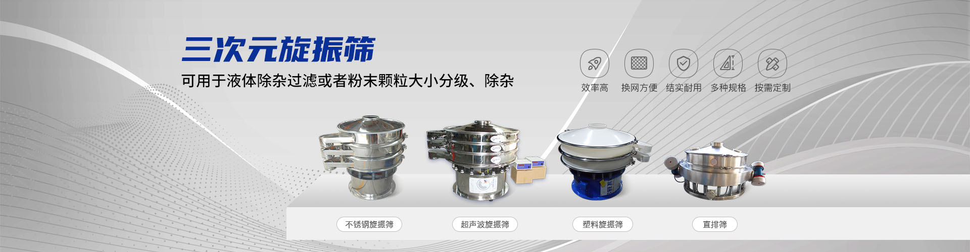 公司的主要產(chǎn)品有:三次元旋振篩、直線振動篩、圓形搖擺篩、方形搖擺篩、脫水篩、超聲波振動篩、塑料振動篩、直排篩、高頻篩、450過濾篩、實(shí)驗(yàn)篩、斗式提升機(jī)、皮帶輸送機(jī)、過濾器、振動電機(jī)等,
